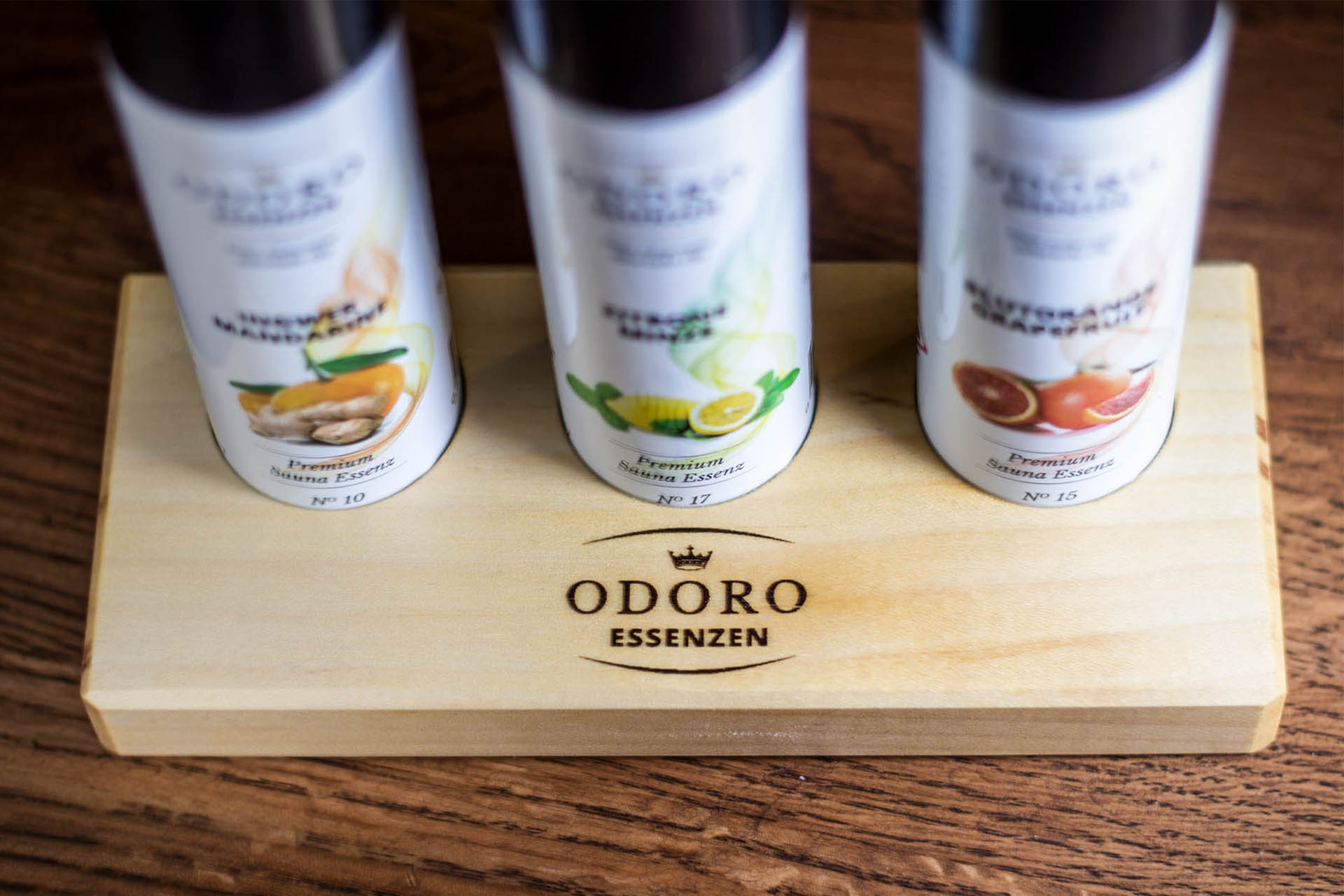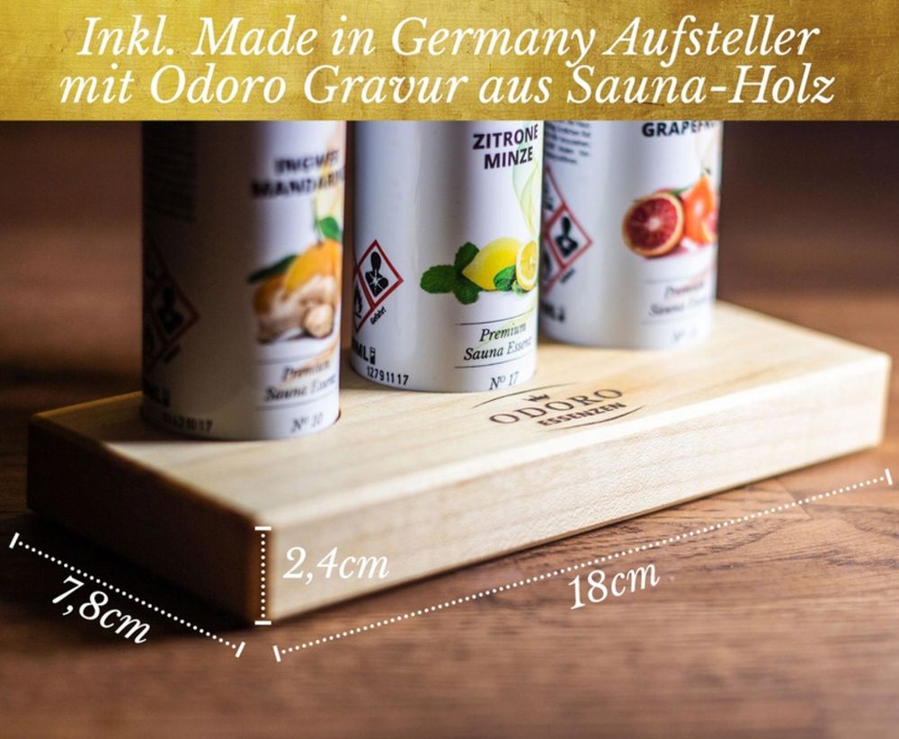 Die Saunadüfte stehen auf einem geölten Holzständer, welcher in Franken in Handarbeit gefertigt wurde. Aus echtem Saunaholz "Ahorn" mit hochwertiger Laser Gravur.